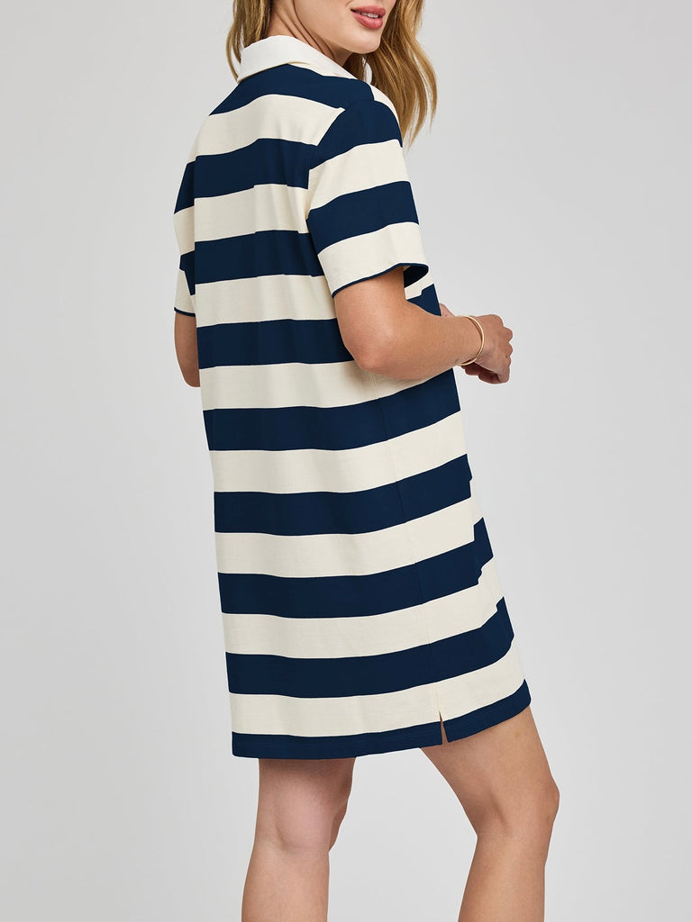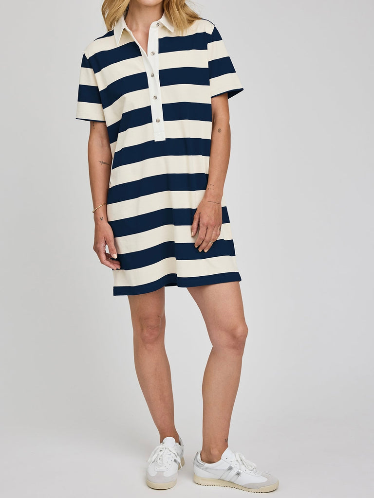 The Colbie dress is made of a cotton jersey with a classic rugby stripe. Features include a contrast collar, half placket button closure, and side slits.