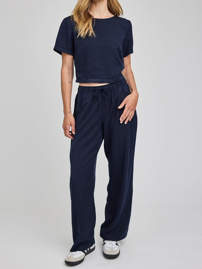The Gabriel pant is made of tencel twill fabric that has been garment dyed to achieve a dimensional look and soft feel. Features include slash pockets and an elasticated waistband with adjustable drawcord.