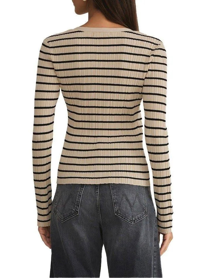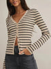 This striped button-up sweater has that perfect fitted vibe, made from soft ribbed fabric that hugs you just right. With a flattering v-neck and long sleeves, it’s the kind of piece you’ll want to layer up or style solo whem you want to elevate your casual look.