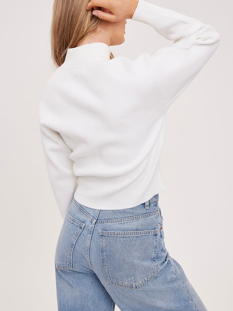 The Rowan sweater is made of a soft yarn in a smooth knit pattern. Features include a mock neckline and 2-way metal zipper closure.